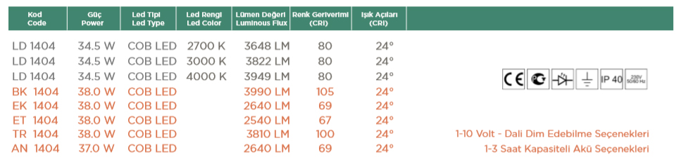 • Balık Led, Ekmek Led, Et Led, Altın Led, Tekstil Renk Led ürünlerinin tablo bilgileri aşağıdadır.